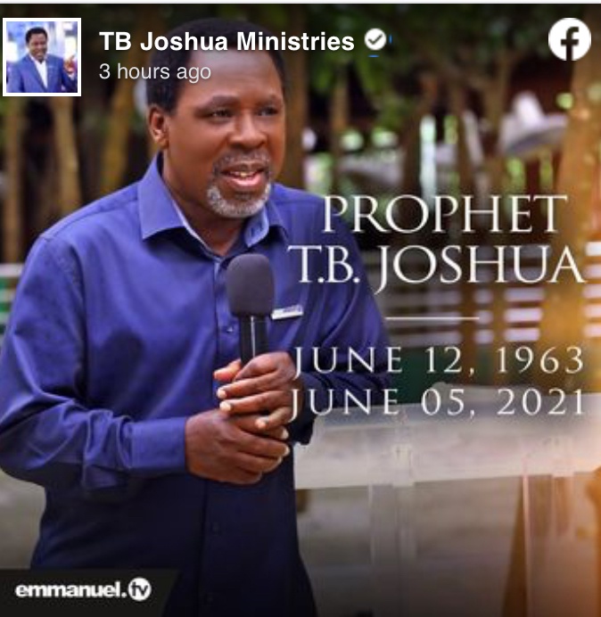Welcome to the only official tb joshua ministries facebook page. Official twitter for tb joshua ministries. Tb joshua is the leader and founder of the synagogue church of all nations, scoan. On 3 june in a facebook post on his tb joshua ministries account, he told his followers he where is the evidence, reports and death documents from the hospital or where ever, how can they just pronounce him dead. ''the synagogue, church of all nations and emmanuel tv family appreciate your love, prayers and concern at this time and request a time of privacy for the family.